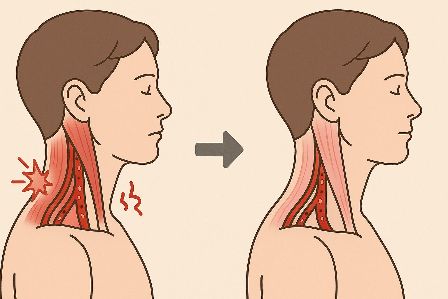 Denne kombinasjonen av stramme nakkemuskler og redusert blodgjennomstrømning leder raskt til stivhet, hodepine, kroniske nakkesmerter … og i mange tilfeller stor risiko for nakkeoperasjon!